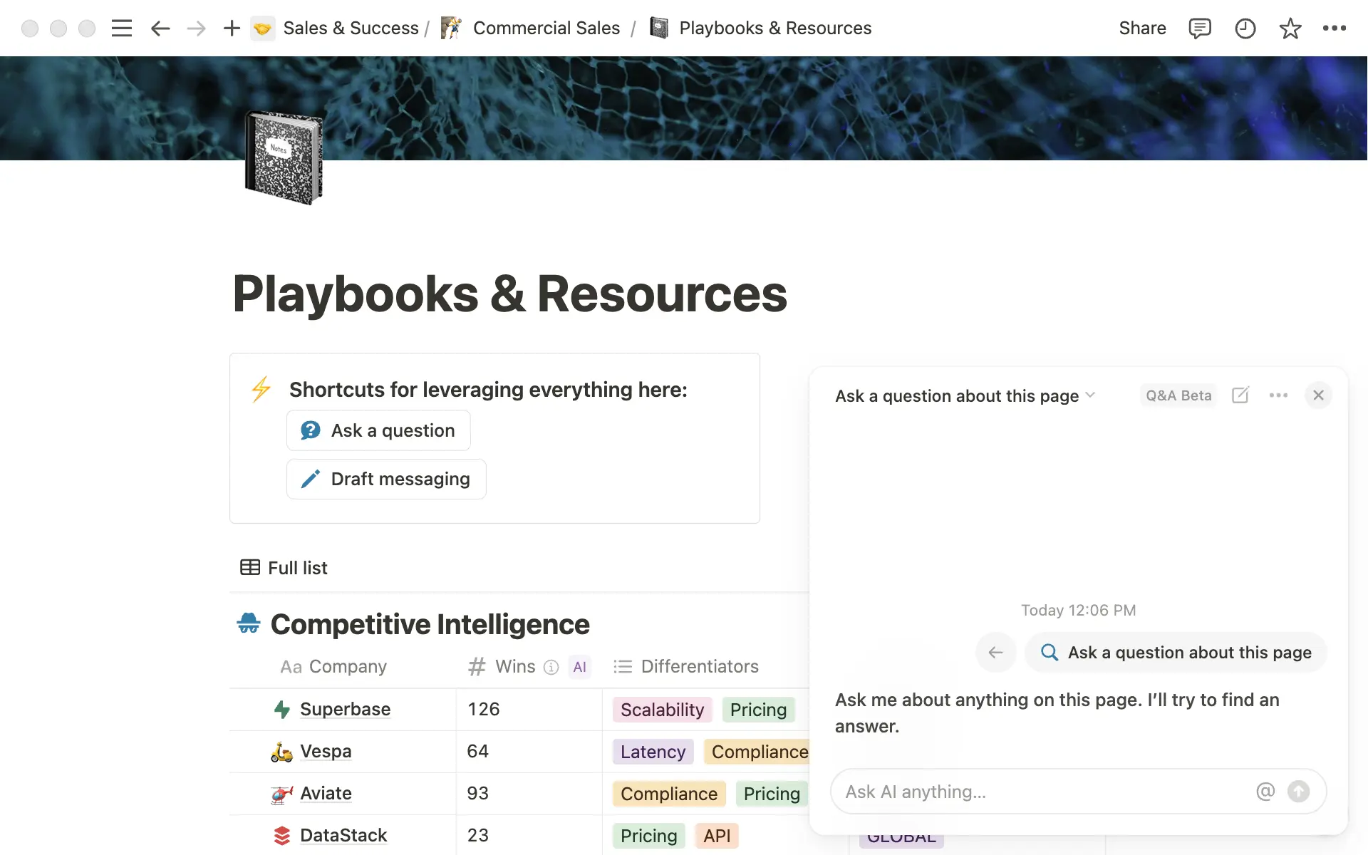 When sellers are on calls with customers they need instant access to the knowledge in your battle cards, competitive analysis, roadmap, and more. With Notion AI, all they need to do is ask a question, and they’ll get an instant response.