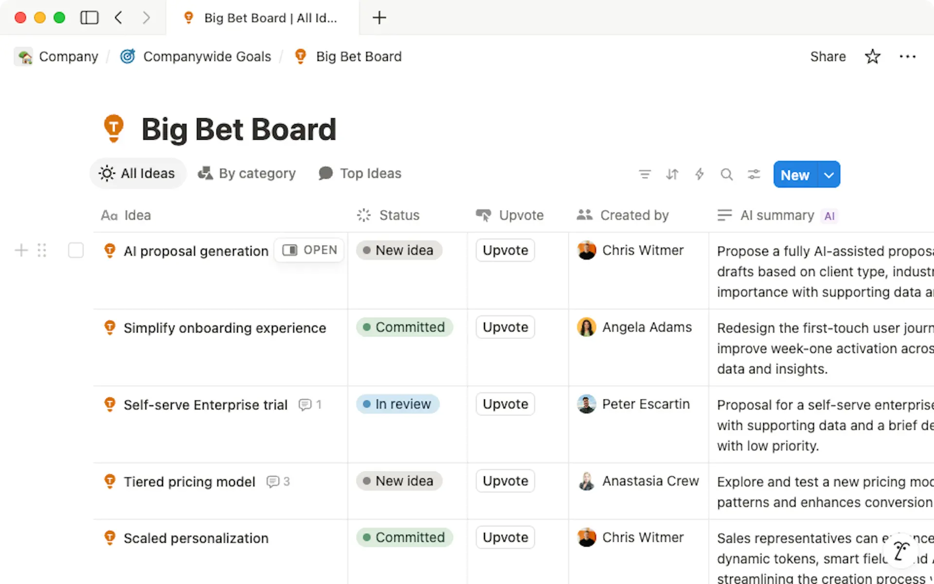 A collaborative space where anyone can propose, upvote, and shape the company’s biggest priorities—powered by Notion’s AI and connected to the work that brings ideas to life.